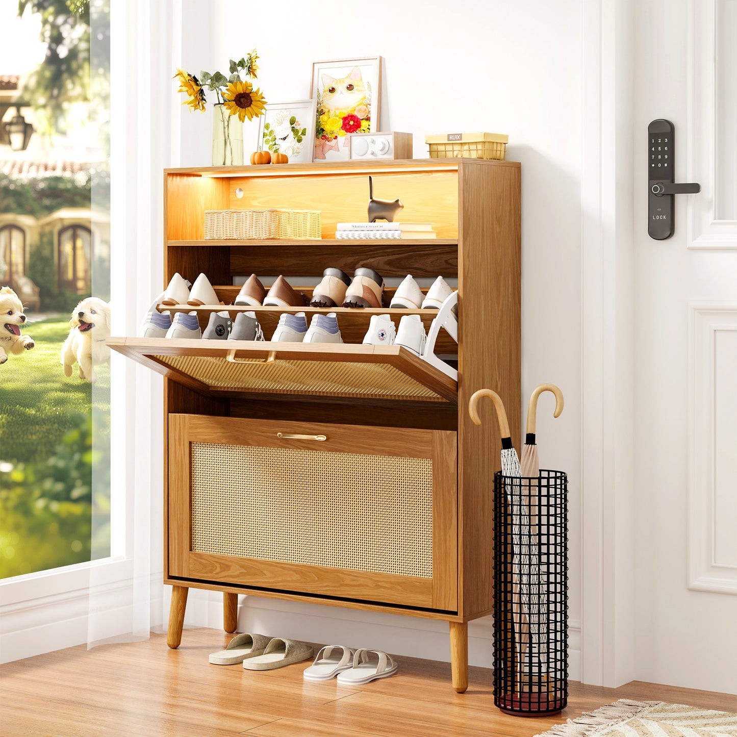 LED Shoe Cabinet with 2 Flip Drawers, Wood 20Pair Shoe Storage Cabinet with Lights for Entryway, Modern Shoe Rack Organizer for Living Room, Rattan Door Design, Brown