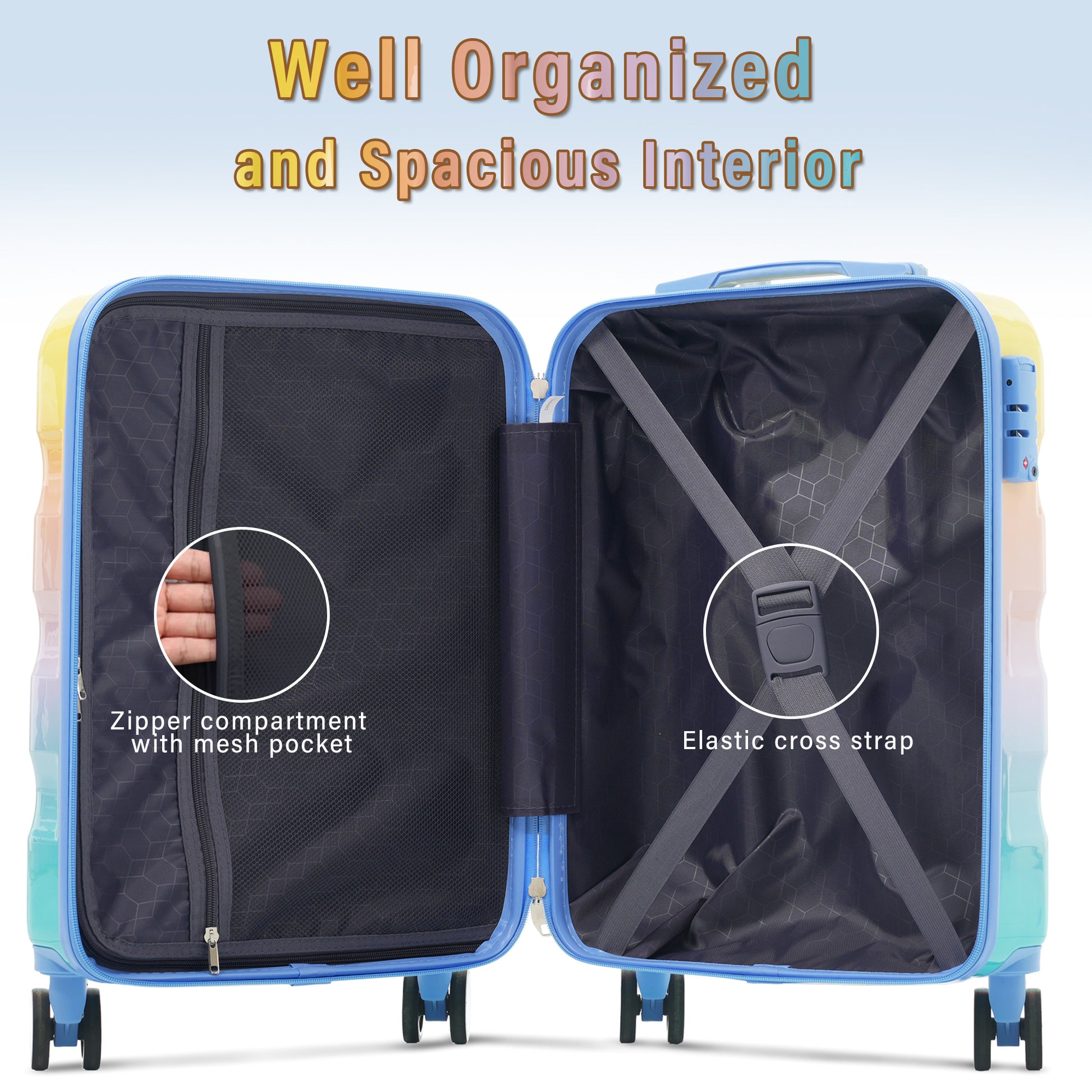 Stylish Gradient Design: This hardside suitcase features a glossy gradient finish that is stylish and fun, making it especially suitable for kids who want their own unique travel gear. Unlike ordinary travel bags, the vibrant design not only adds energy but also makes your rolling luggage easy to identify at baggage claim.