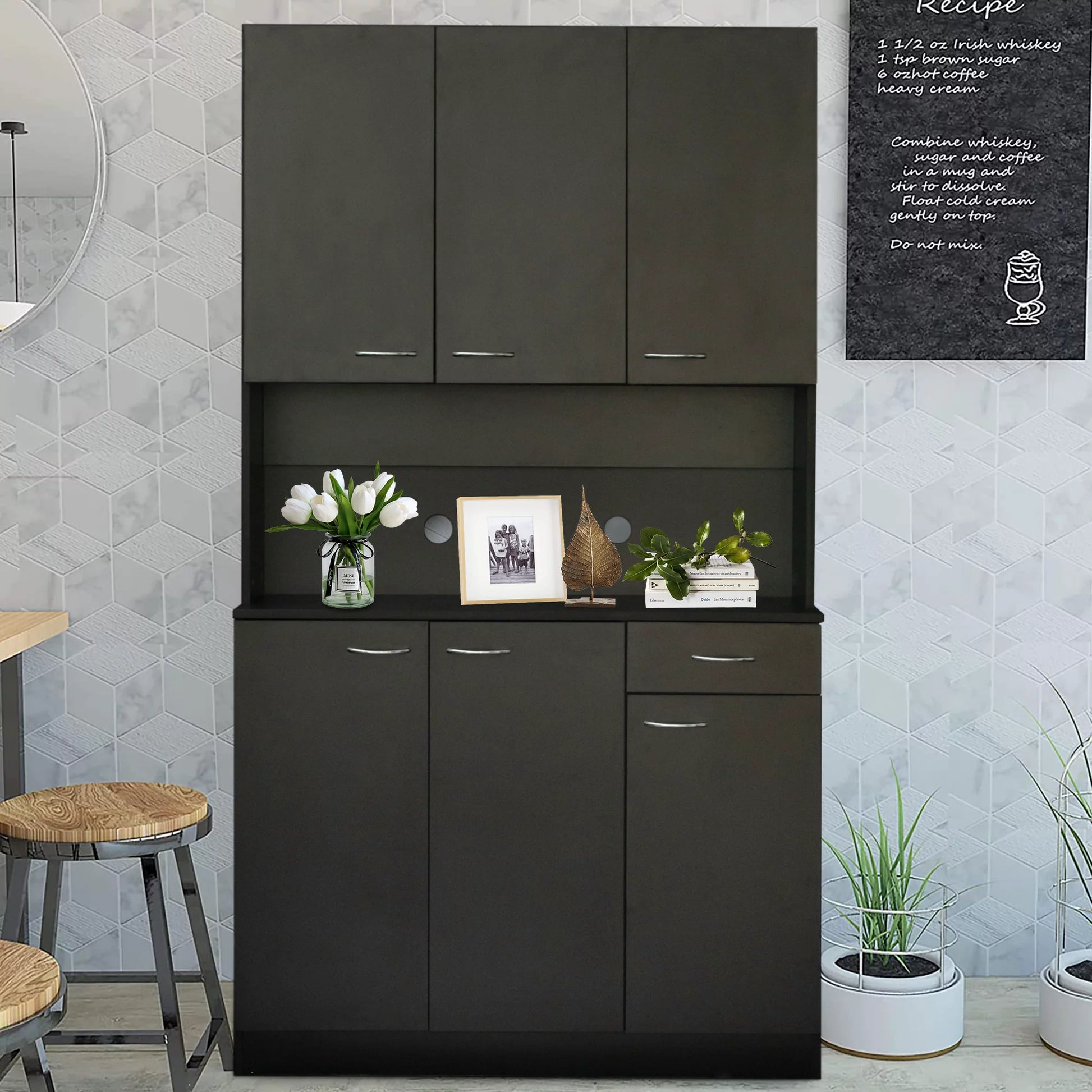 paproos Buffet Cabinet with Hutch, Kitchen Pantry Storage Cabinet, Black Sideboard for Kitchen, Storage Microwave Cabinet with Storage Space