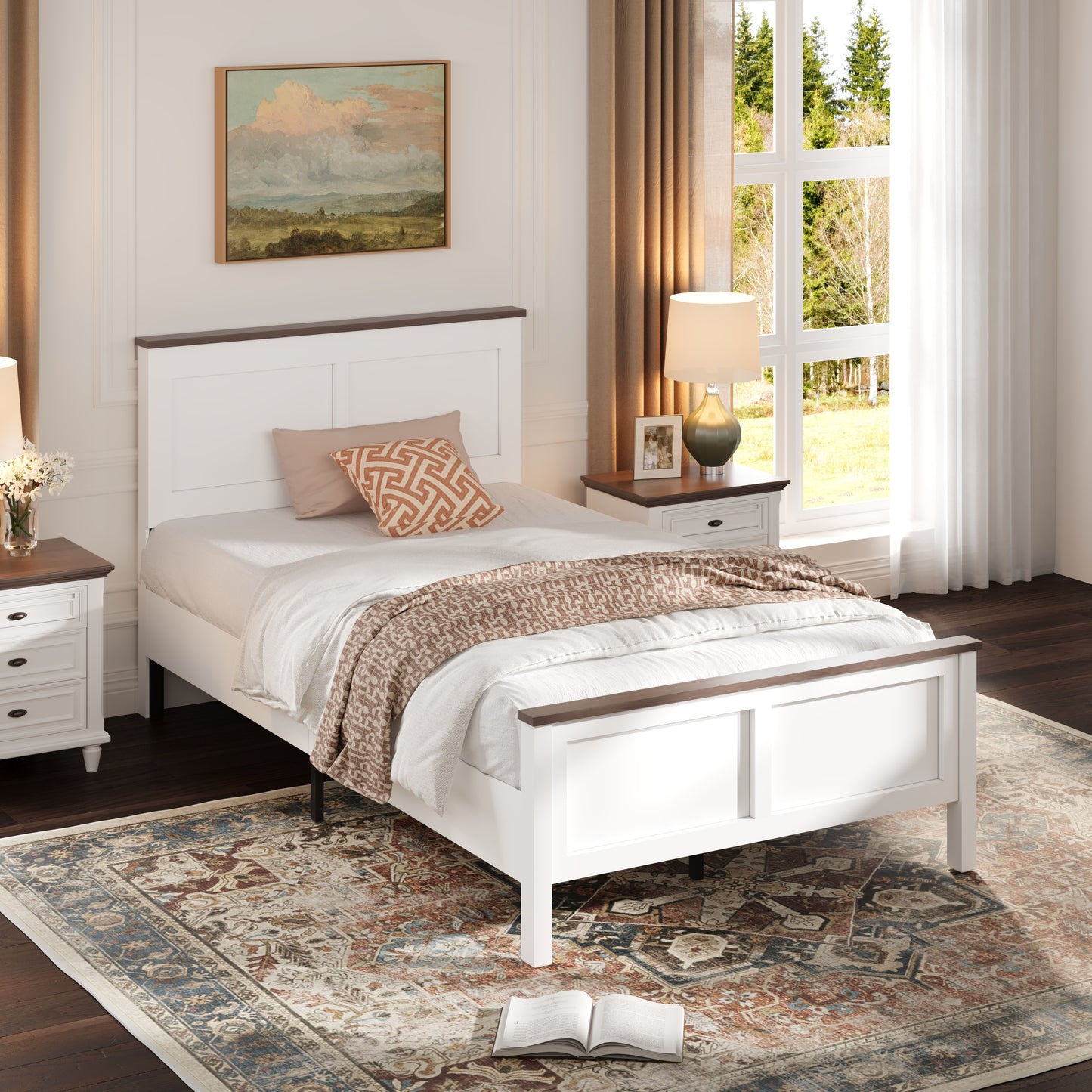 Elevate your bedroom with this farmhouse-chic bed frame, blending rustic charm and modern durability. Crafted from sturdy wood with reinforced iron legs and support beams, it ensures enhanced weight capacity. The crisp white finish is accented by rich brown woodgrain panels on the headboard and footboard, offering timeless elegance. Versatile enough to complement both vintage and contemporary décor, its balanced design adds a statement piece to any space.