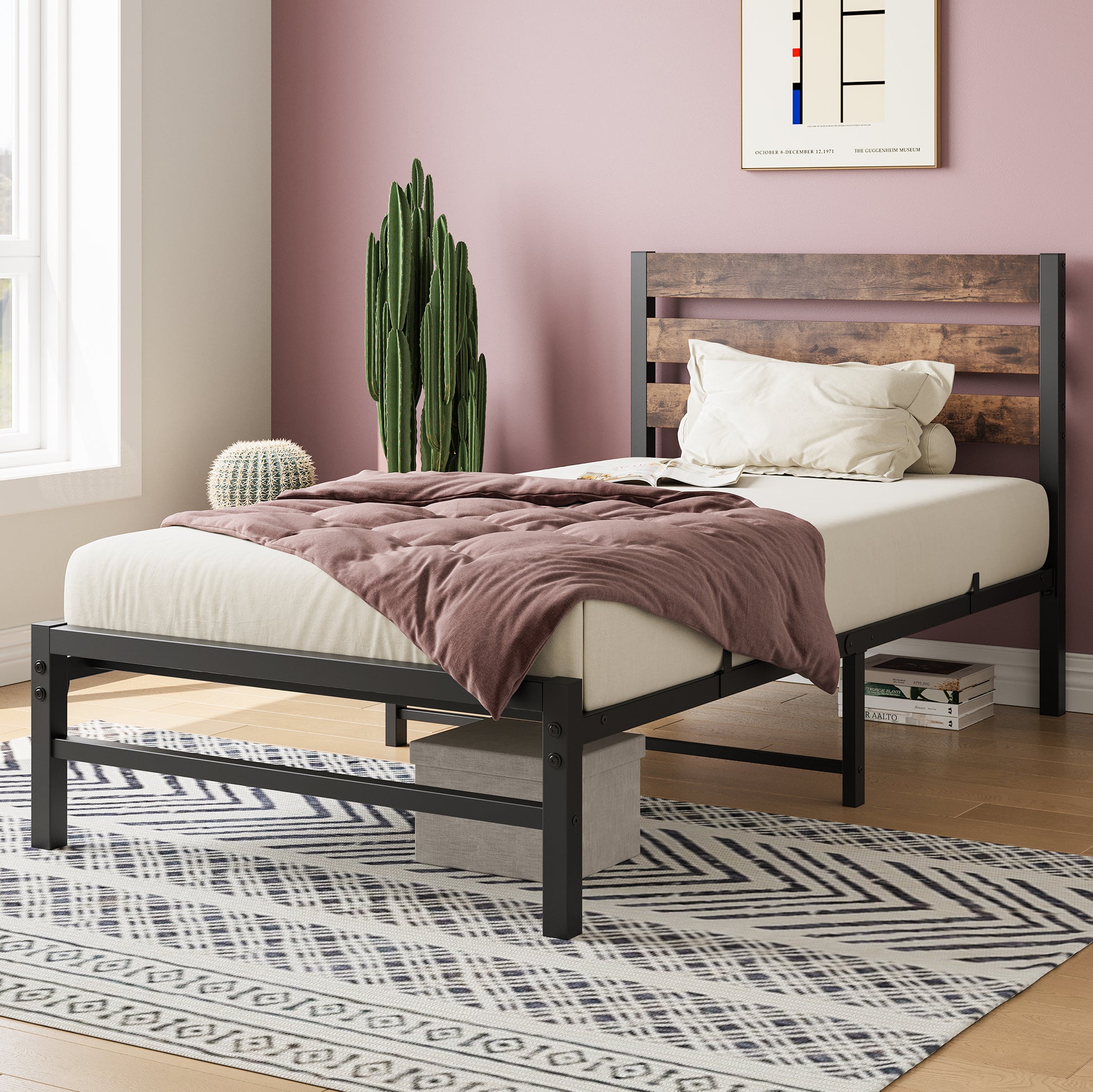 PAPROOS Twin Bed Frame, Metal Twin Platform Bed with wooden Panel Headboard, No Box Spring Needed